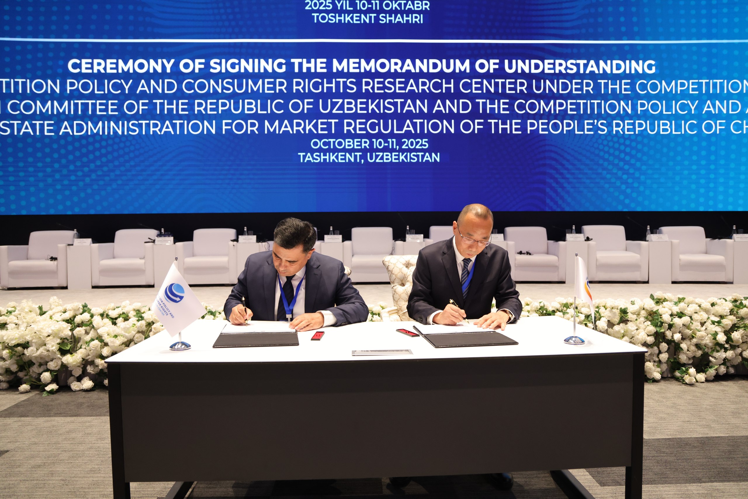 Халқаро конференция доирасида Ўзбекистон Республикаси Рақобатни ривожлантириш ва истеъмолчилар ҳуқуқларини ҳимоя қилиш қўмитаси ҳузуридаги Рақобат сиёсати ва истеъмолчилар ҳуқуқлари тадқиқотлари маркази директори Олимжон Жумаев Хитой Халқ Республикасининг Бозорни тартибга солиш давлат бошқармаси ҳузуридаги Рақобат сиёсати ва баҳолаш маркази директори Лю Синхай ва «Марказий Осиё Финтех Ассоциацияси» ННТ раиси Отабек Насиров билан ўзаро англашув ва ҳамкорлик тўғрисидаги Меморандумларни имзоладилар.
