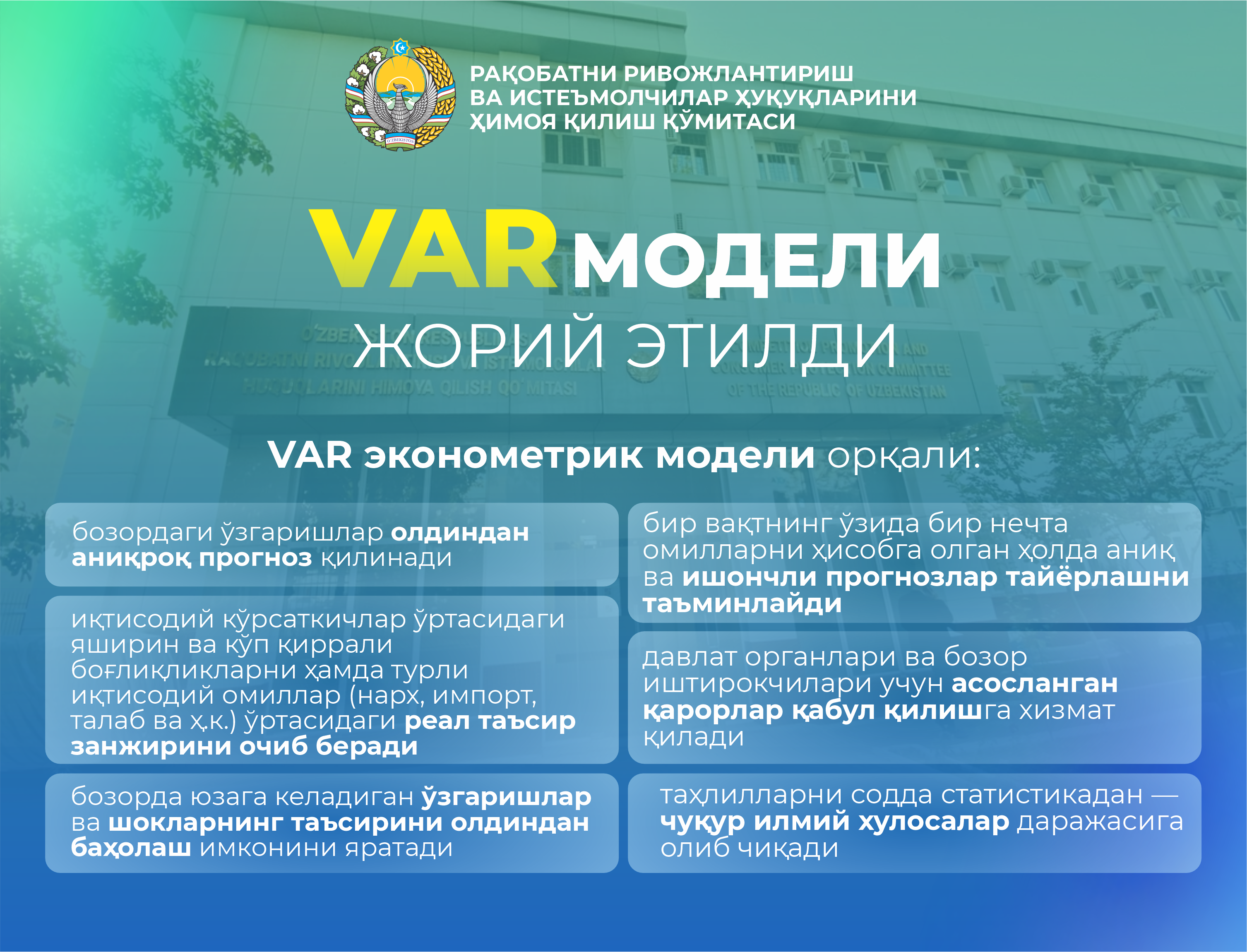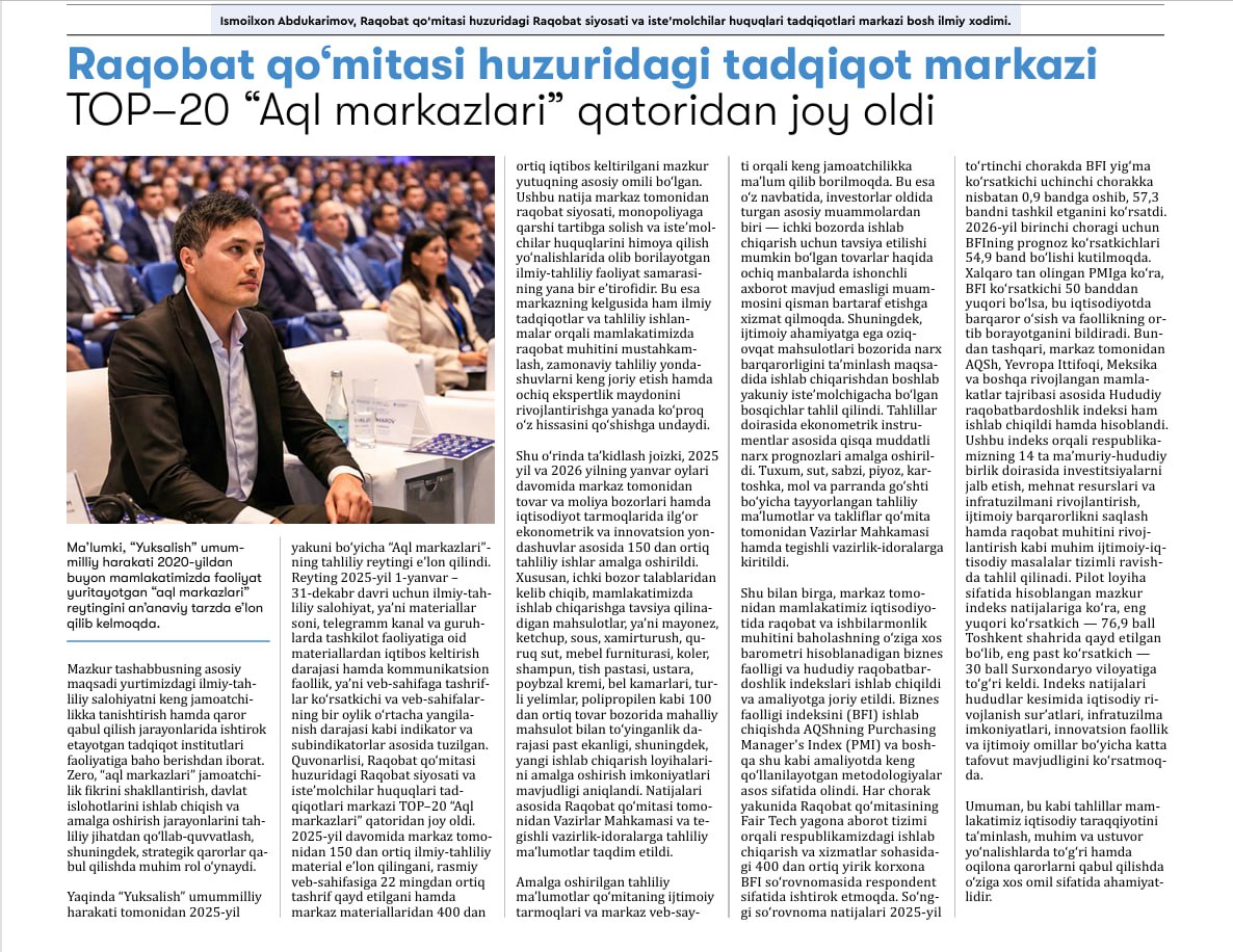 Товар ва молия бозорлари ва иқтисодиёт тармоқларида рақобат муҳитини таҳлил қилиш бўйича илмий тадқиқотлар ўтказиш, бозорга киришдаги мавжуд тўсиқларни таҳлил қилиш ва рақобатни ривожлантириш бўйича таклифлар ишлаб чиқиш.