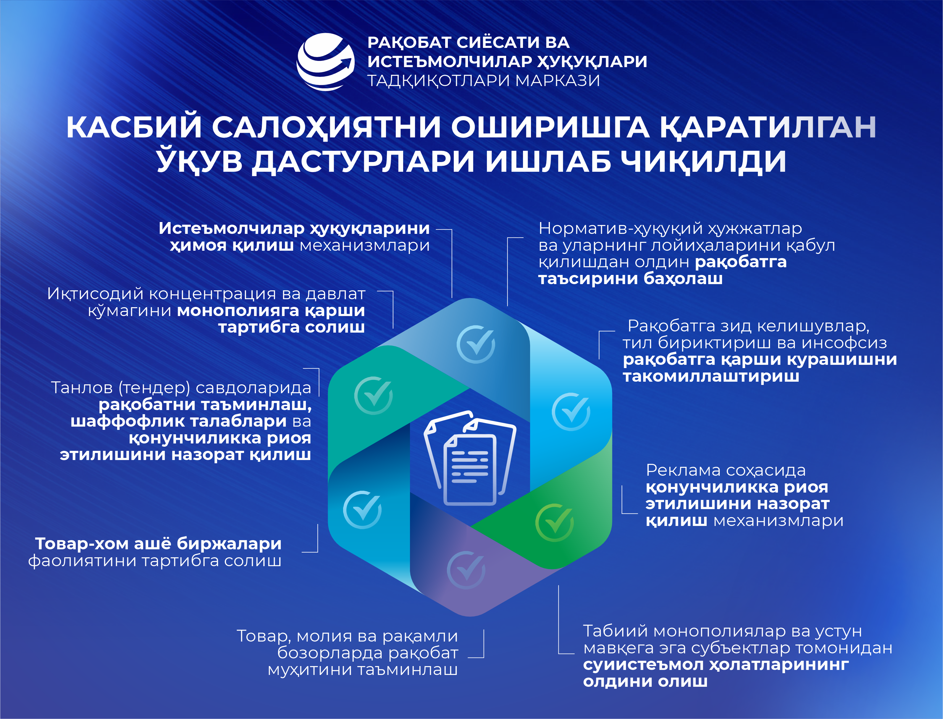 Рақобат сиёсати, давлат харидлари, фонд биржаси, истеъмолчилар ҳуқуқларини ҳимоя қилиш ва реклама бозорини такомиллаштириш масалалари бўйича фундаментал илмий тадқиқотлар олиб бориш, рақобат соҳасида самарали хорижий тажрибани жорий этиш ва уни миллий тизимга мувофиқлаштиришни таъминлаш.