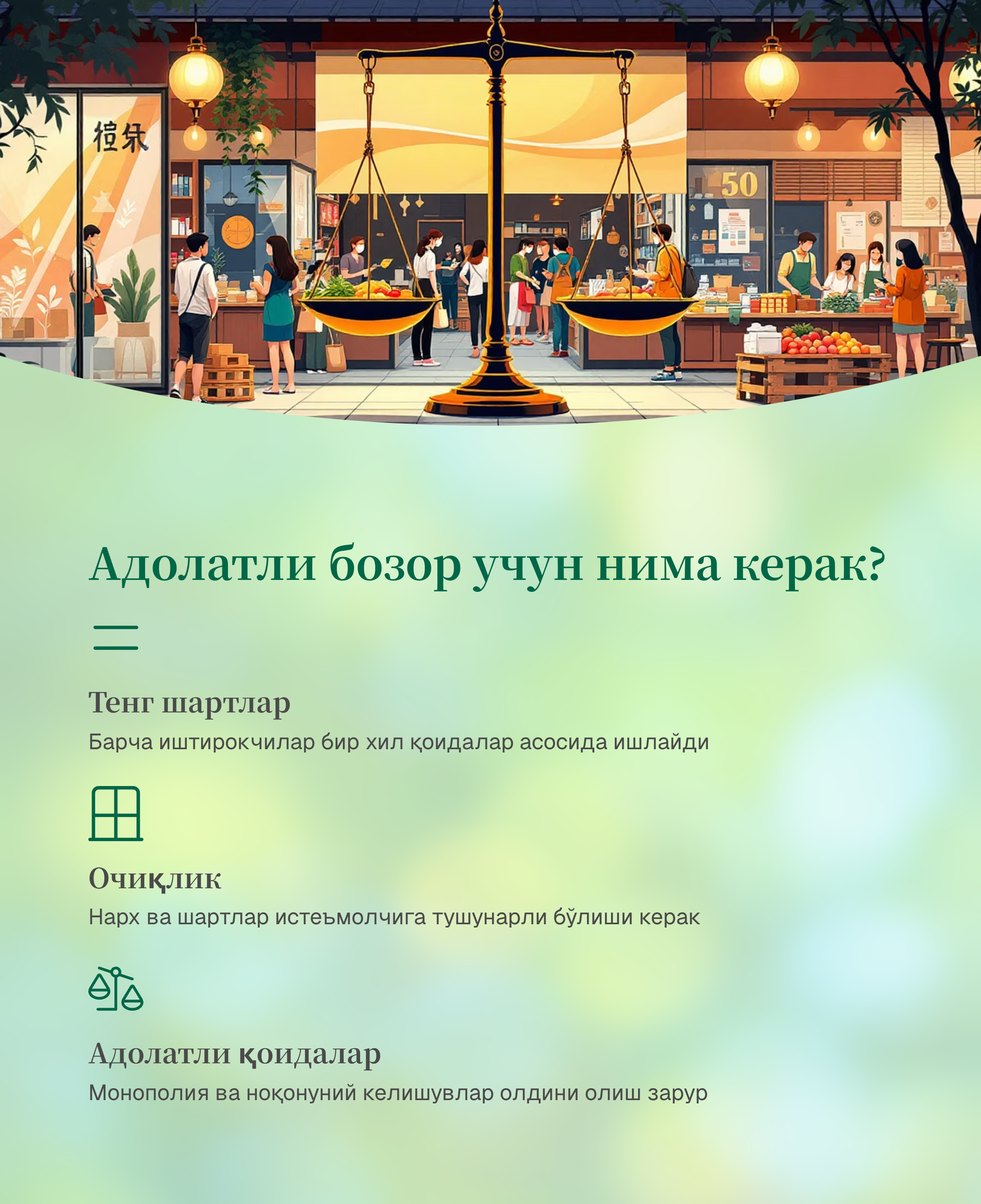 Шунинг учун ҳар бир бозорда тенг шартлар, очиқлик ва адолатли қоидалар таъминланиши муҳим.