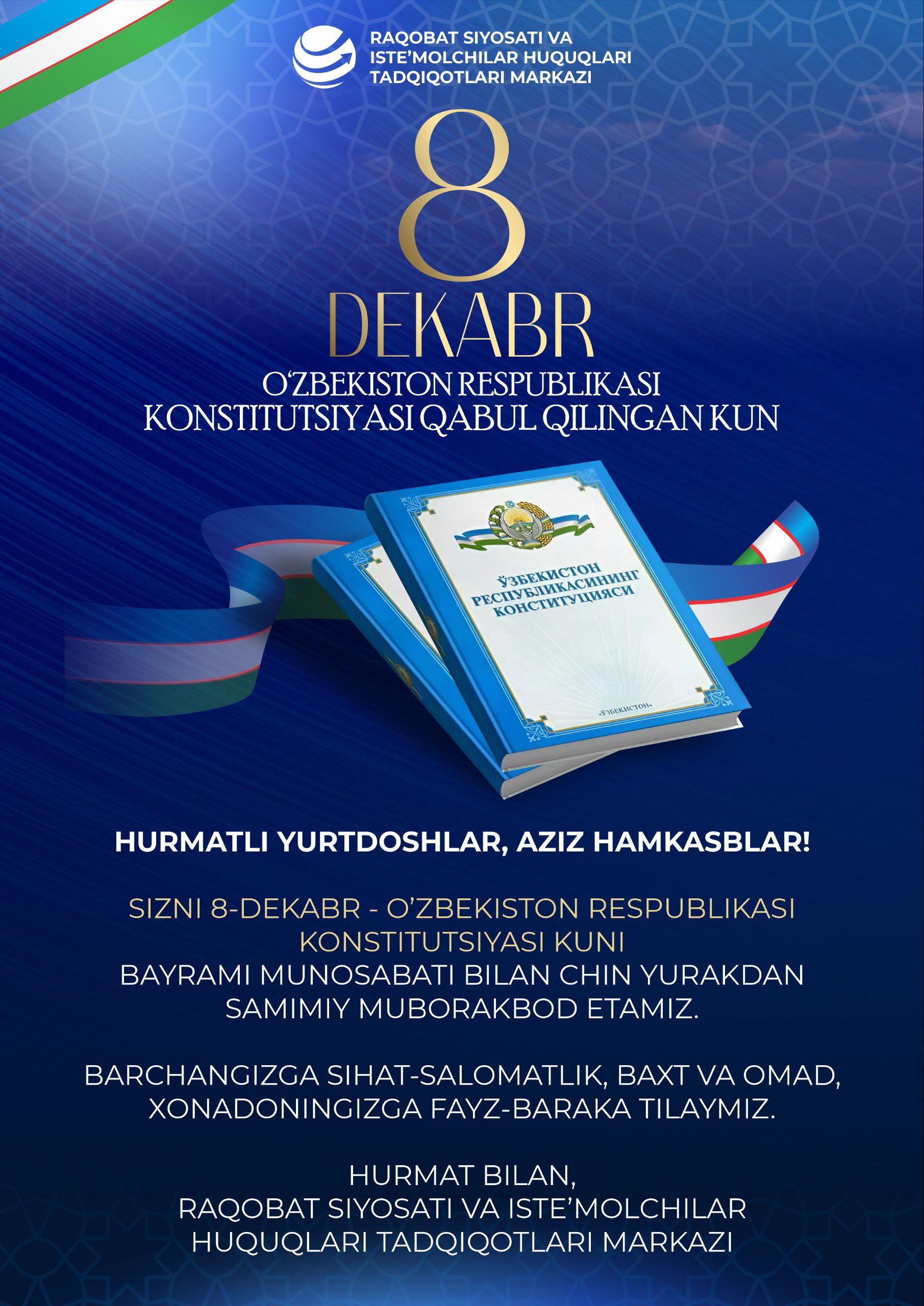 We sincerely congratulate you on December 8 - the day the Constitution of the Republic of Uzbekistan was adopted. We wish you all good health, happiness, and success, and may your homes be filled with abundance and blessings. With respect, Competition Policy and Consumer Rights Research Center under the Competition Development Committee