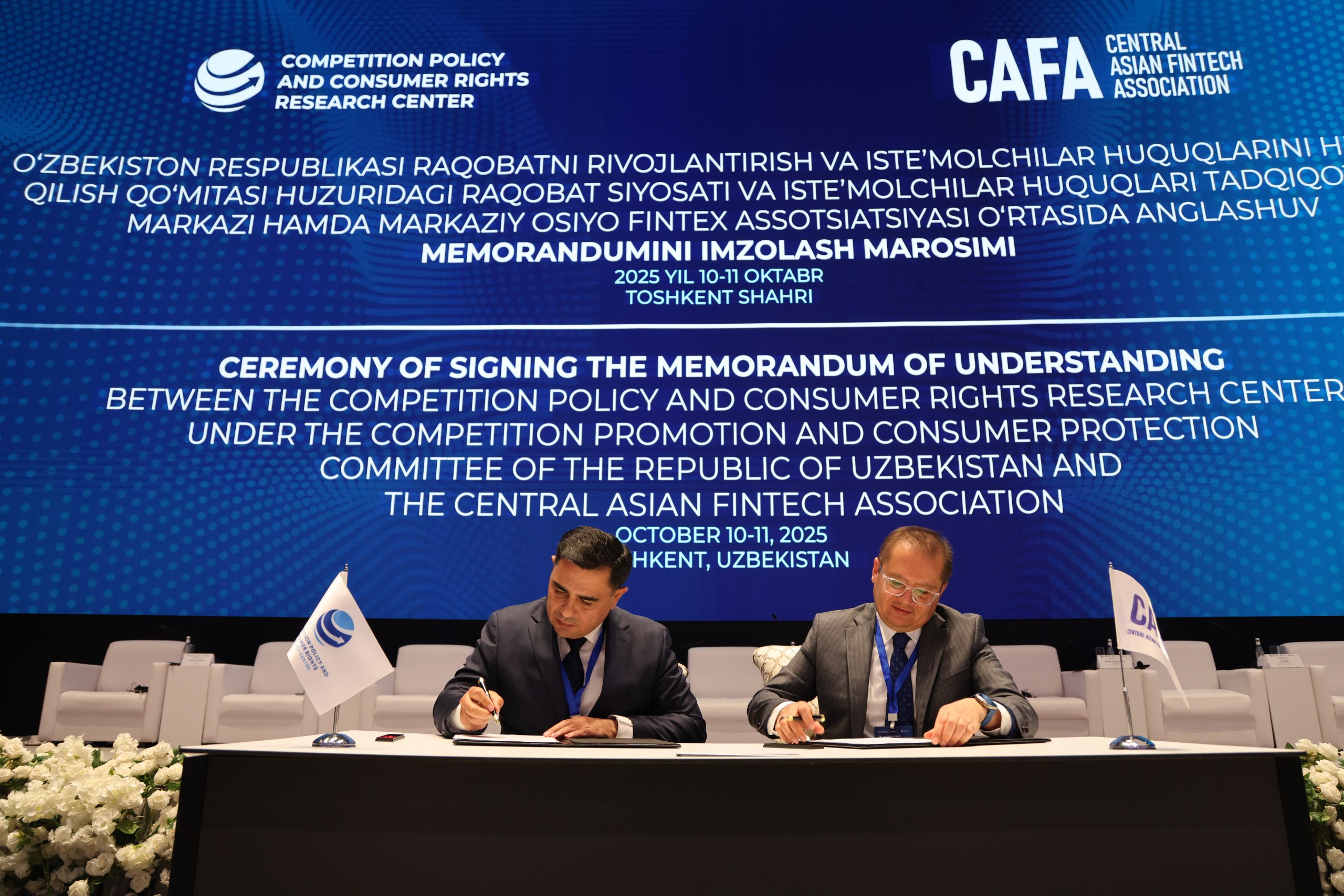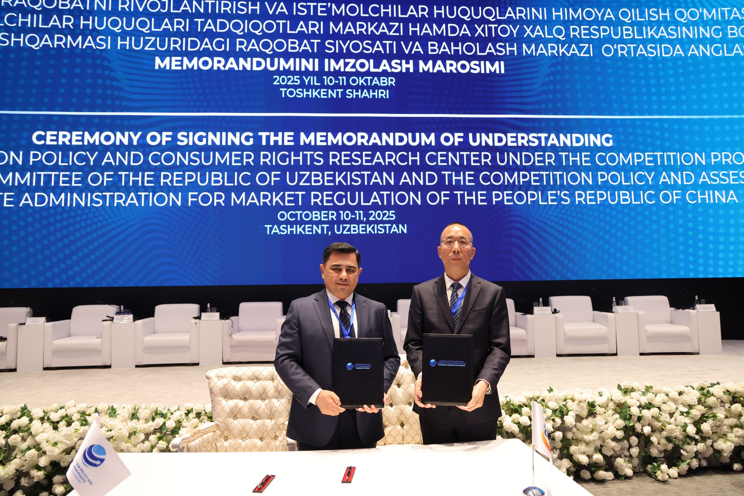 Within the framework of the international conference, Olimjon Jumayev, Director of the Competition Policy and Consumer Rights Research Center under the Competition Promotion and Consumer Protection Committee of the Republic of Uzbekistan, Liu Xinhai, Director of the Competition Policy and Assessment Center under the State Administration for Market Regulation of China, and Otabek Nasirov, Chairman of the “Central Asia Fintech Association” NGO signed Memorandums of Understanding and Cooperation.