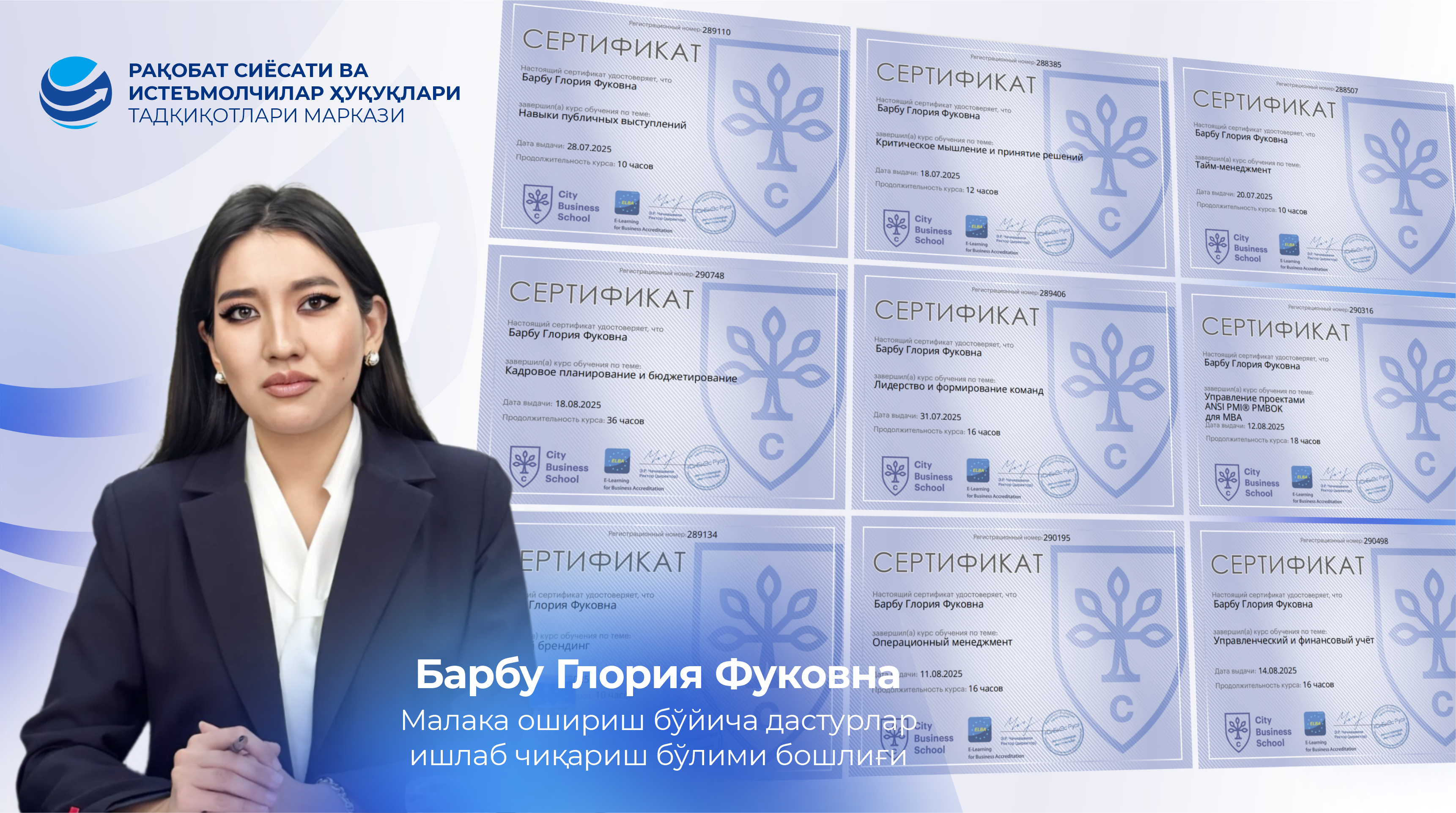 The professional development of the employees of the Competition Policy and Consumer Rights Research Center and their acquisition of modern knowledge has been identified as a priority task. To this end, the Head of the Department for Developing Training Programs of the Center, Barbu Gloria Fucovna, is studying in the internationally recognized "Mini-MBA Intensive" program organized by City Business School. Within the framework of this program, she has deepened her knowledge in modern management, financial management, digital solutions, and strategic analysis. To date, she has successfully completed 9 modules and obtained internationally recognized certificates for each completed module. The participation of our employees in such educational programs not only contributes to their personal professional growth but also serves to enhance the effectiveness of the Center’s activities and to introduce competitive practices into the national economy. The Competition Policy and Consumer Rights Research Center will continue to consistently create opportunities for professional development of all employees in line with international standards and to implement advanced practices. #Gloria Barbu #City Business School #Mini-MBA Intensive