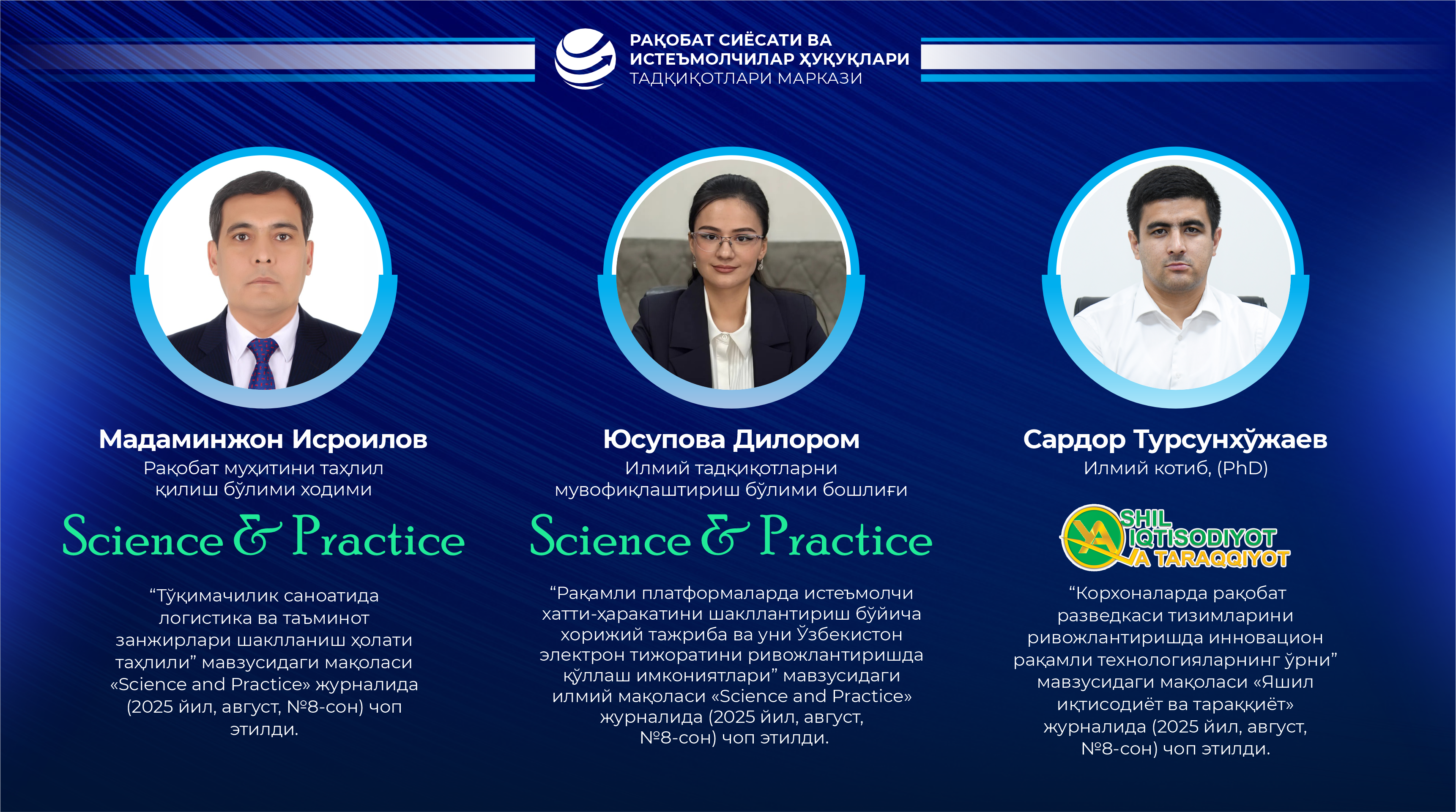 Scientific Secretary, PhD Sardor Tursunkhodjayev – article titled “The Role of Innovative Digital Technologies in the Development of Competitive Intelligence Systems in Enterprises” published in “Green Economy and Development” journal (August 2025, No. 8).Read article:https://zenodo.org/records/16750169 Researcher Dilorom Yusupova – article titled “Foreign Experience in Shaping Consumer Behavior on Digital Platforms and Opportunities for Its Application in the Development of Uzbekistan’s E-Commerce” published in “Science and Practice” journal (August 2025, No. 8).Read article:https://sci-p.uz/index.php/aept/article/view/2951 Researcher Madaminjon Isroilov – article “Analysis of the Formation of Logistics and Supply Chains in the Textile Industry” published in “Advanced Economics and Pedagogical Technologies” journal (August 2025, No. 8).Read article:https://sci-p.uz/index.php/aept/article/view/2950/2753 Currently, Sardor Tursunkhodjayev is pursuing a Doctor of Science (DSc) degree in economics, while Dilorom Yusupova and Madaminjon Isroilov are conducting research to obtain their PhD degrees in economics. These studies contribute to strengthening a healthy competitive environment, accelerating digital transformation processes, and enhancing efficiency in industrial sectors. #Green Economy and Development #Science and Practice #Advanced Economics and Pedagogical Technologies