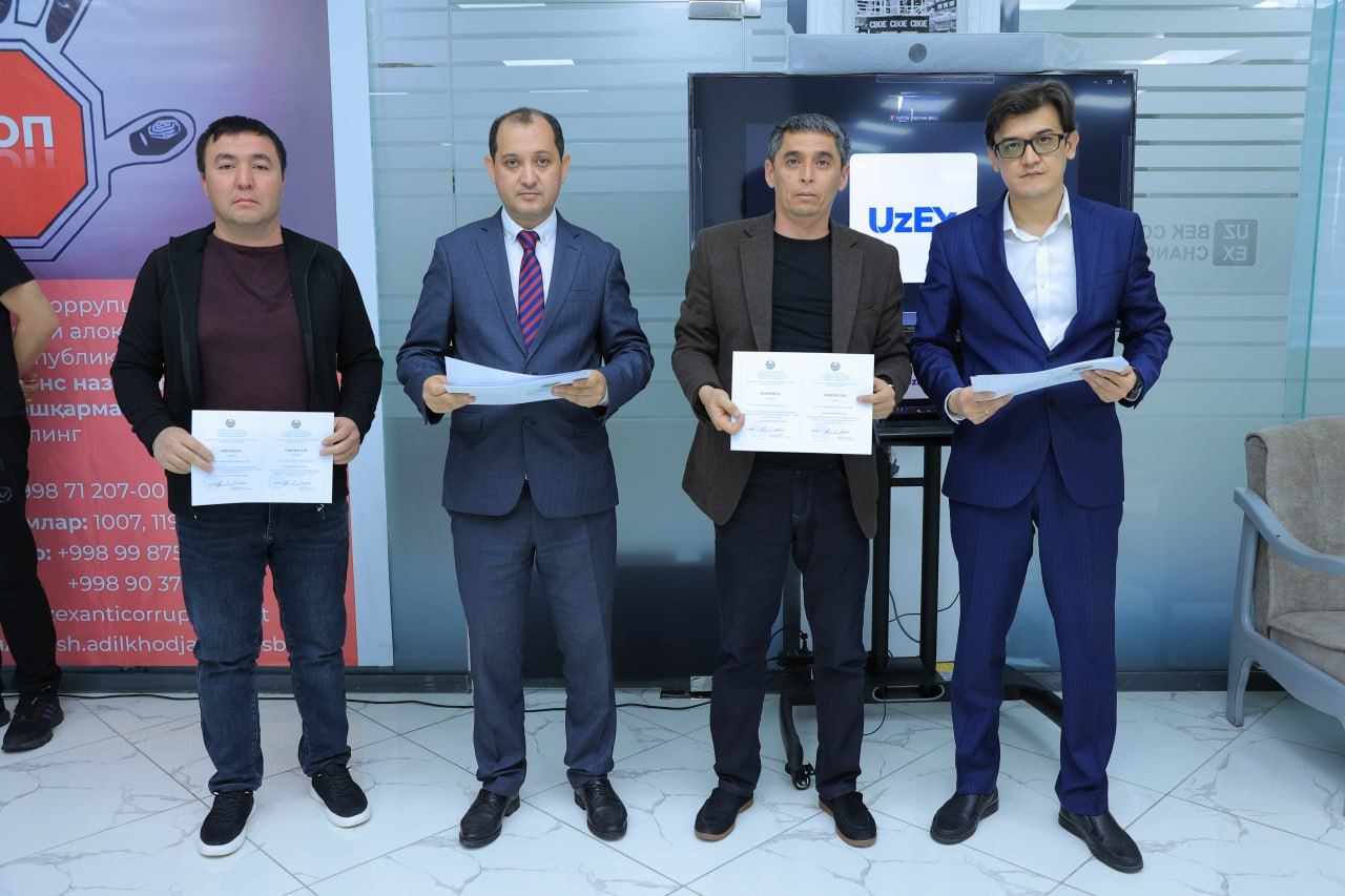 Малака ошириш курси сўнгида биржа иштирокчиларига (брокер, трейдер) махсус сертификатлар топширилди.