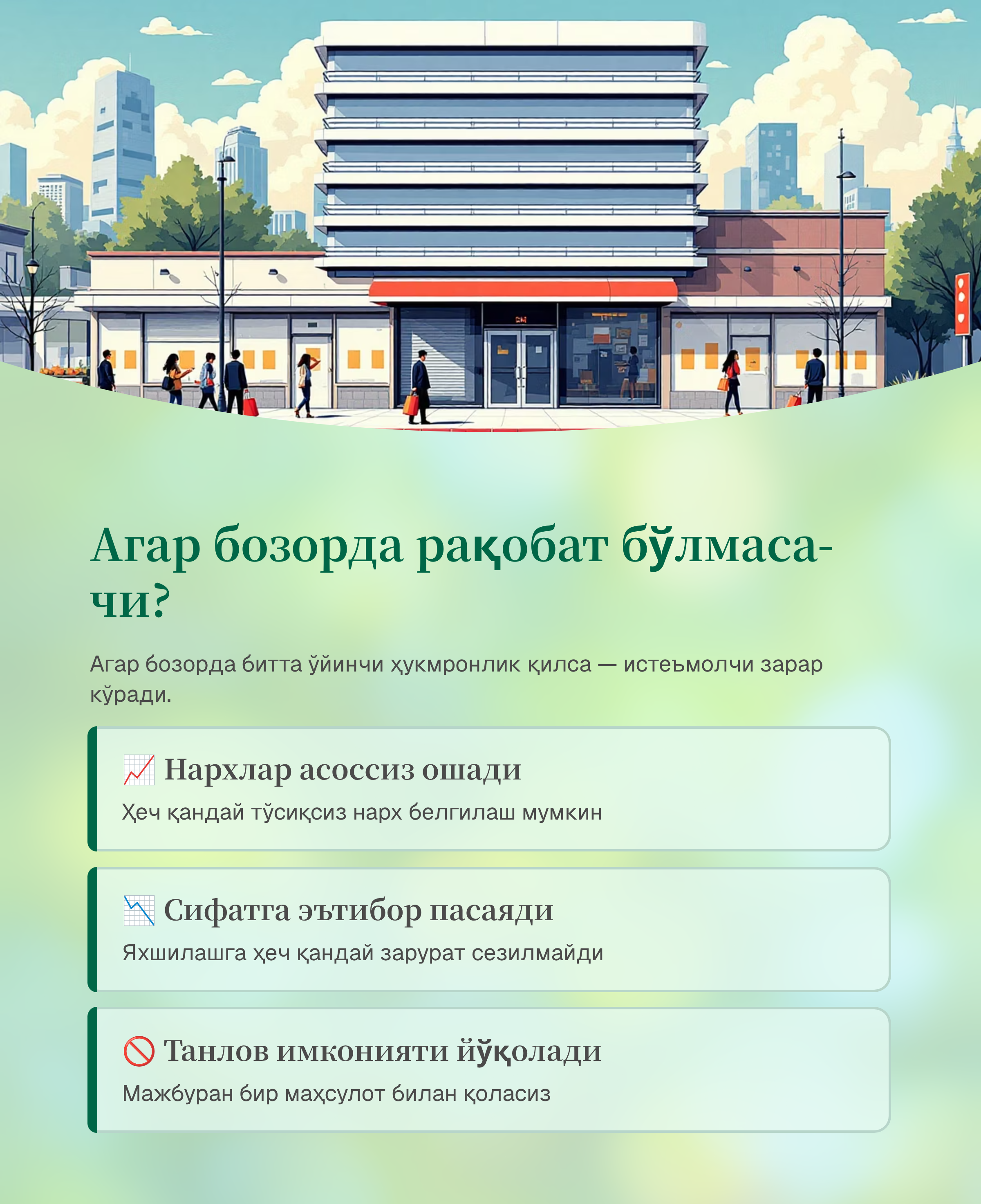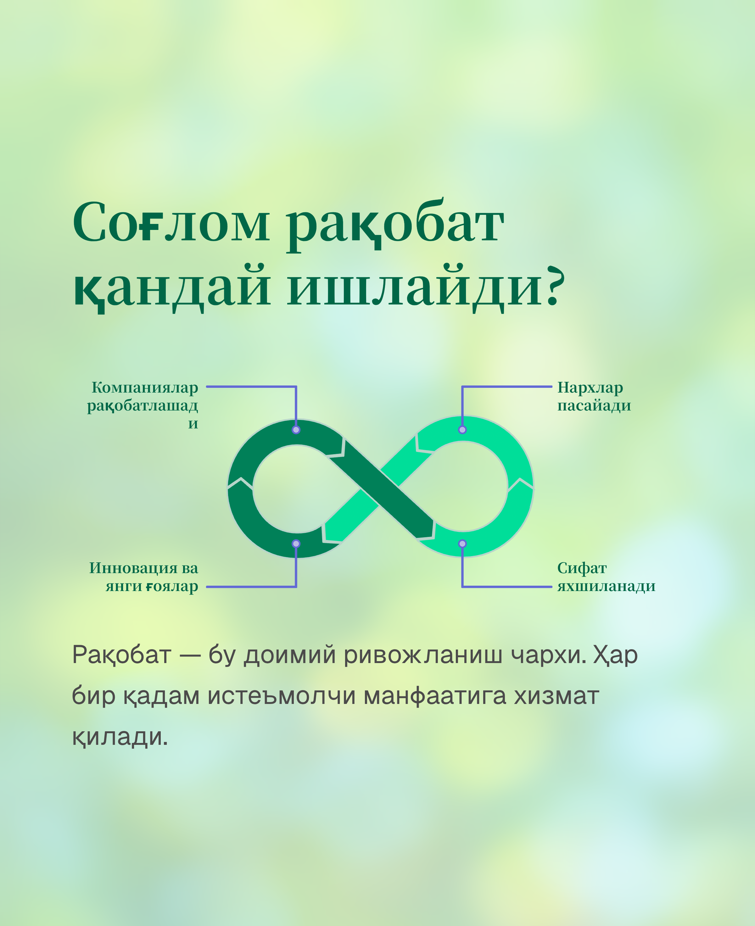 Энг муҳими, рақобат — бу фақат бизнес учун эмас, балки истеъмолчи манфаати учун хизмат қиладиган механизмдир.