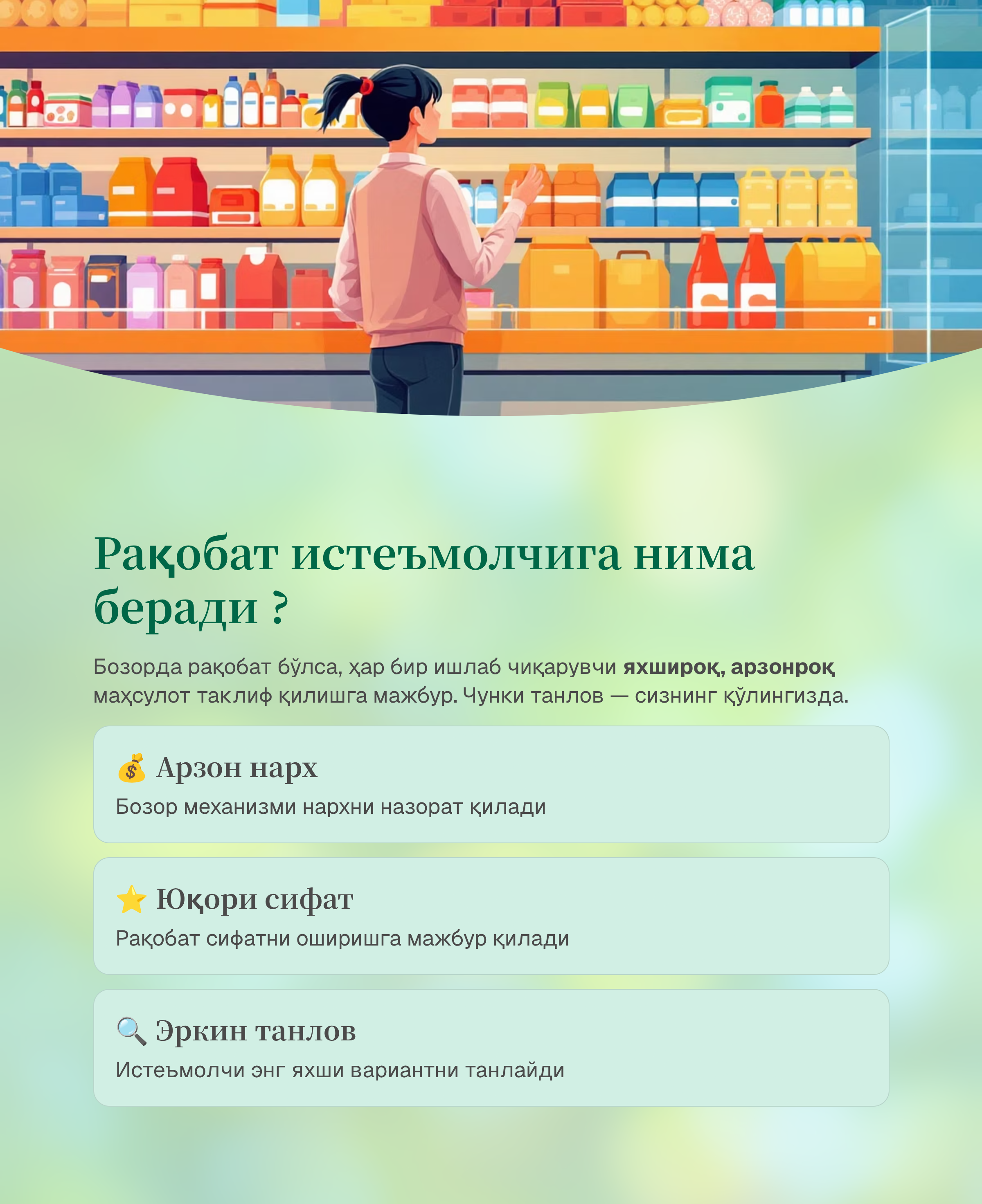 Бозордаги нархлар нега баъзан пасаяди, маҳсулот сифати эса яхшиланади? Бунинг асосий сабаби — соғлом рақобат.